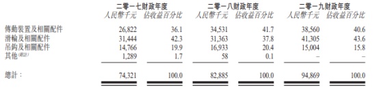 其中,传动装置及相关配件占收益百分比从2018财年的41.7%下降至2019财年的40.6%,而滑轮及相关配件占收益百分比则从37.8%上升至43.6%。