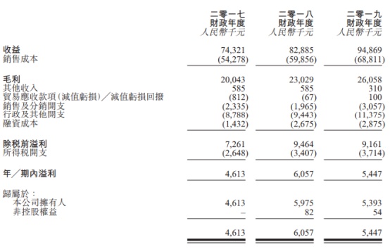 于2017财政年度、2018财政年度及2019财政年度,公司的收益分别约为人民币7430万元、人民币8290万元及人民币9490万元,相当于上升约11.5%及与去年同期相比上升14.5%。