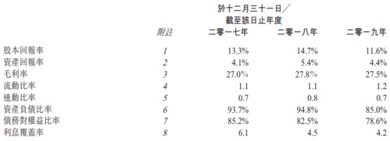 于2017财政年度、2018财政年度及2019财政年度,公司的毛利率保持稳定,分别为27%、27.8%和27.5%;资产负债率为93.7%、94.8%和85%。
