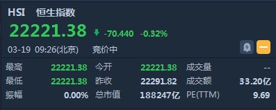 智通财经APP获悉,恒生指数开盘跌70.44点或0.32%,报22221.38点。国企指数跌0.87%,报8724.08点。红筹指数1.37%,报3230.48点。大市盘前成交33.2亿港元。
