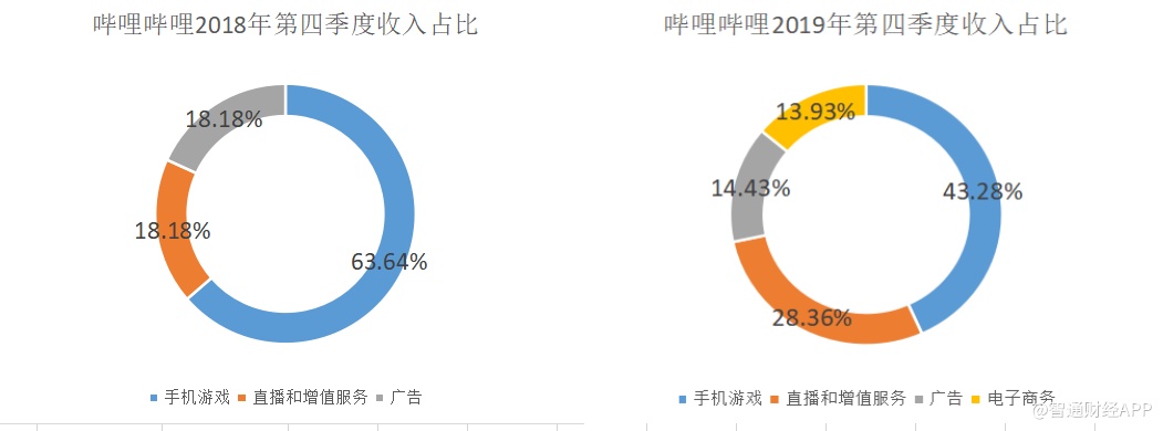 但至2019年第四季度时,依赖游戏的局面得到明显改善。智通财经APP发现,该季度内,游戏收入占比已下降至43.28%,而直播和增幅服务的收入占比由18.18%提升至28.36%,提升近10个百分点。与此同时,电子商务后来居上,从收入占比不足1%一跃提升至13.93%,极具爆发性。