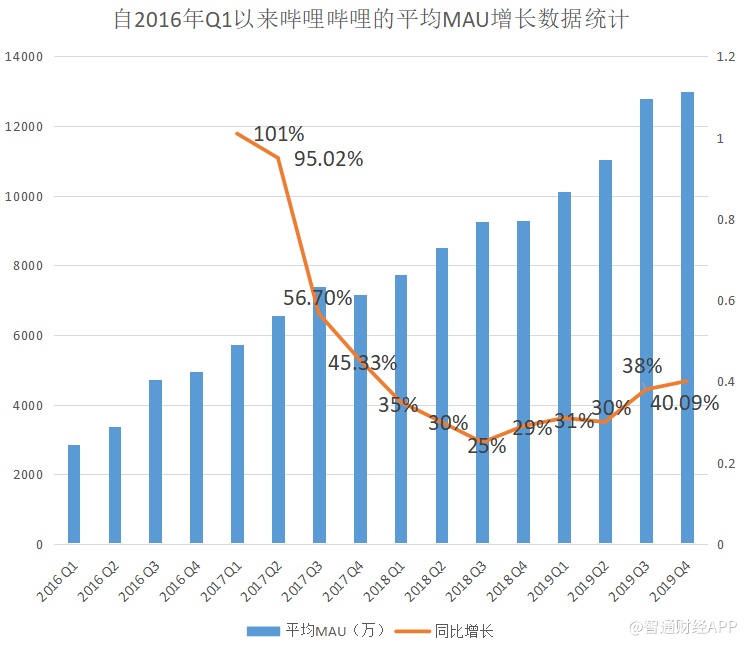 从MAU的增长也能看出这一趋势。智通财经APP发现,B站的月活跃用户增长速度自2018年第三季度的25%后便一路回暖,至2019年第四季度时,同比增速已回升至40%以上,月活跃用户逐渐重回高增长轨道。
