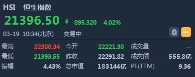 智通财经APP获悉,恒指早盘跌幅持续扩大,失守两万二关口,低见21369.5点,创2016年8月以来新低。截至10时34分,恒指跌895.32点或4.02%,报21396.5点,成交额555.8亿港元。