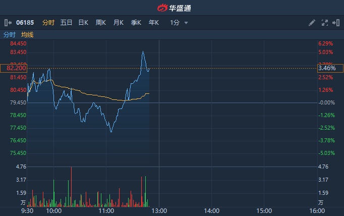 智通财经APP获悉,康希诺生物(06185)与军事科学院军事医学研究院生物工程研究所联合团队合作研发的重组新型冠状病毒疫苗(腺病毒载体)近日获批临床,开始在武汉市开展一期试验,成为全国首款进入临床研究阶段的新冠候选疫苗。该利好持续发酵,康希诺生物盘中由跌转涨,截至发稿,涨3.15%,报81.95港元,成交额7066.68万港元。