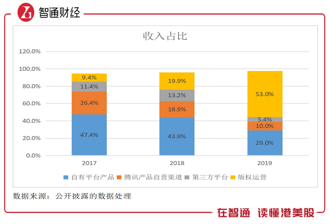 由此,阅文收入结构实现了主动调整,版权运营逐渐成为收入核心。2019年,版权运营业务收入贡献53%,较2017年提升了43.6个百分点,而在线业务收入贡献为44.4%,较2017年占比90.6%下降了40.8个百分点,其中第三方平台收入贡献占比下降至个位数,这说明阅文对第三方渠道的依赖逐年降低。