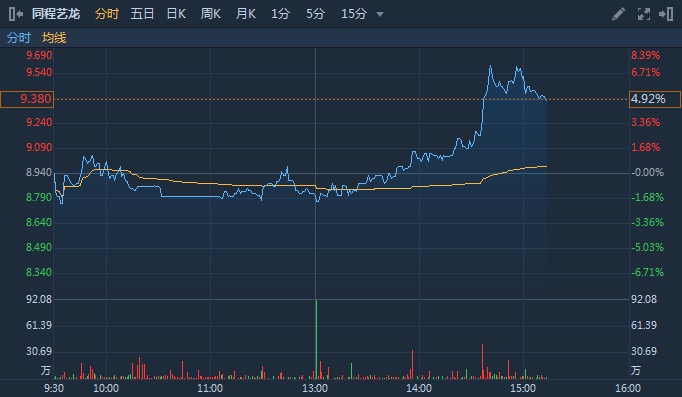 今日同程艺龙盘中超涨5%,截至北京时间15:11,涨5.26%,报9.40港元。