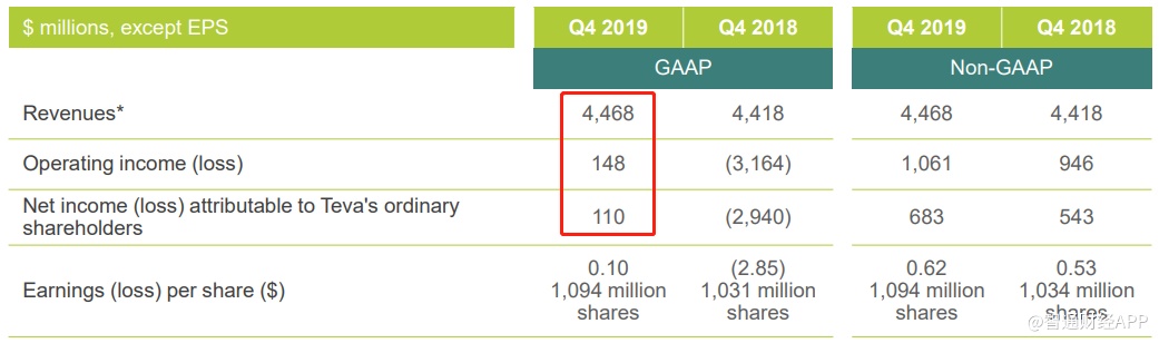 2月12日美股盘前,梯瓦制药公布了2019财年第四季度及全年业绩报告。数据显示,公司Q4营收同比增长1%至44.68亿美元,其中,北美地区营收同比增长6%,Generics营收同比增长2%,而仿制药Copaxone营收则同比下滑22%。