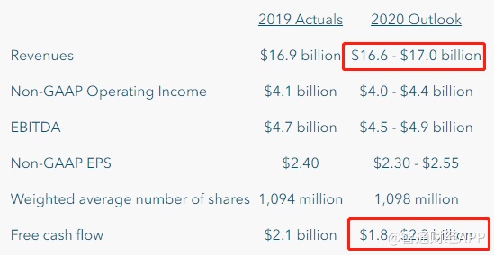 2019财年全年,公司总营收为169亿美元,自由现金流为20亿美元,GAAP每股亏损0.91美元,non-GAAP每股盈利2.4美元。