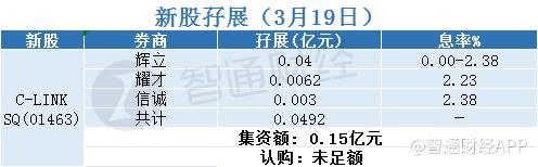 智通财经APP获悉,3月19日,C-LINK SQ(01463)正在招股中。辉立、信诚、耀才共借出0.0492亿港元,认购未足额。
