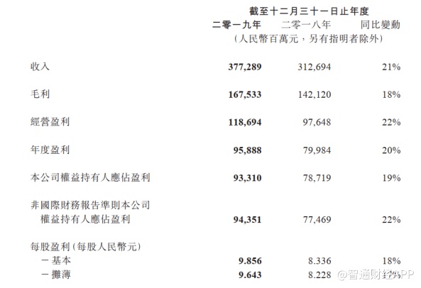 2019年全年收入为3772.89亿元人民币,同比增长21%,全年净利润为933亿元人民币,同比增长19%。
