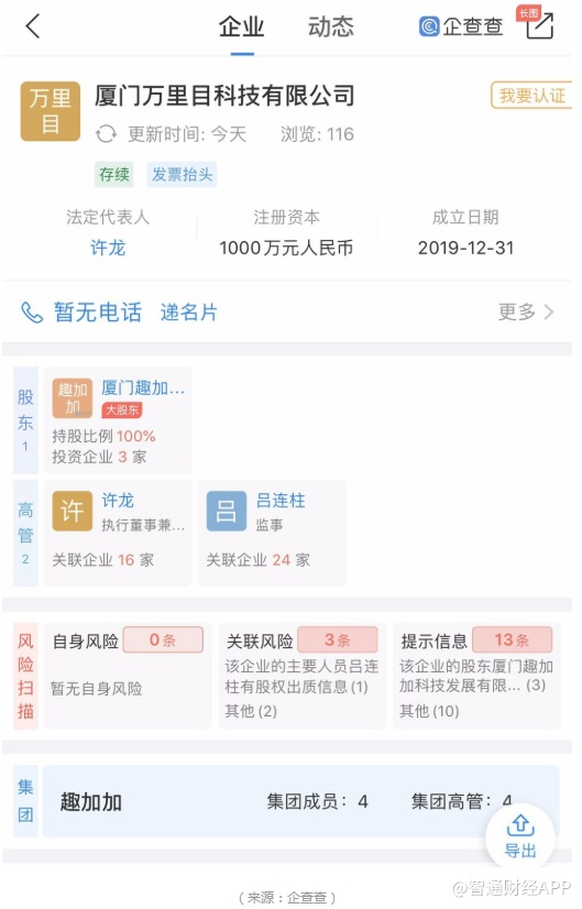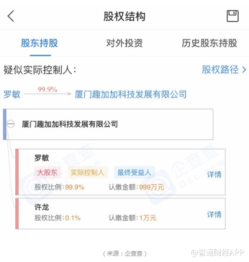 企查查显示,厦门趣加加科技发展有限公司成立于2019年6月5日,注册资本1000万元人民币,许龙是法定代表人,疑似实际控制人是罗敏,持股99.9%。