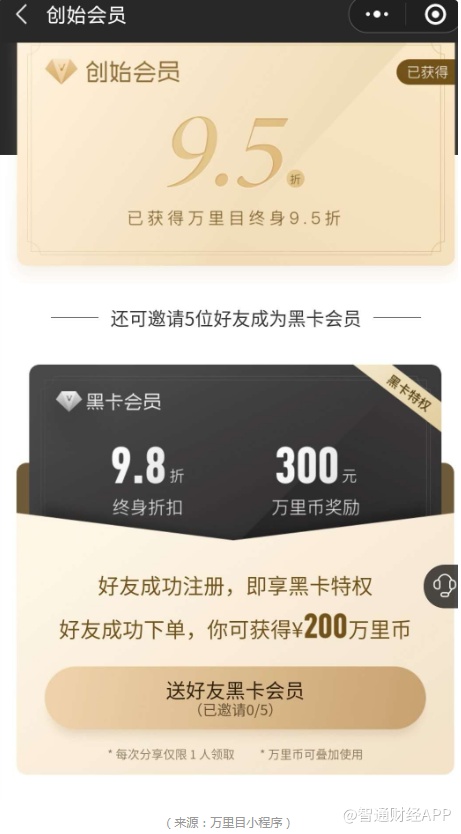 异观财经通过微信登录万里目小程序发现,被邀请成为创始会员的用户,可获得终身9.5折,获得平台奖励的500元万里币。目前小程序中有三位专属顾问可选,页面显示:可根据喜好挑选1V1专属顾问,选择后暂不支持变更。