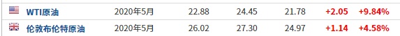 截至发稿,WTI原油涨9.84%,报22.88美元/桶。布伦特原油涨4.58%,报29.02美元/桶。