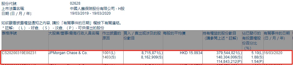 智通财经APP获悉,联交所最新资料显示,3月16日,摩根大通增持中国人寿(02628)871.5871万股,每股作价15.0934港元,总金额约为1.32亿港元。增持后持股数目为3.80亿股,持股比例为5.10%。
