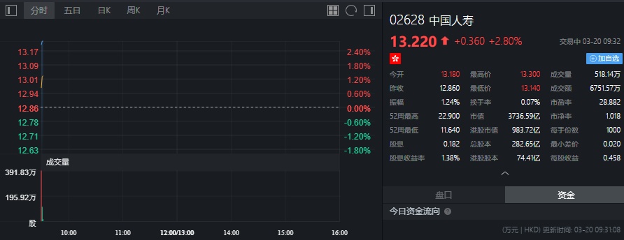 截至发稿,中国人寿涨2.80%,报13.22港元。