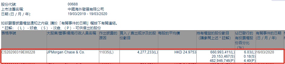 智通财经APP获悉,联交所最新资料显示,3月16日,摩根大通增持中国海外发展(00688)427.7233万股,每股作价24.9753港元,总金额约为1.07亿港元。增持后持股数目为6.61亿股,持股比例为6.03%。