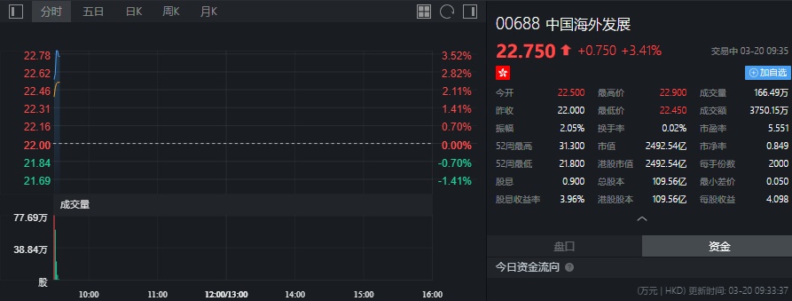截至发稿,中国海外发展涨3.41%,报22.75港元。
