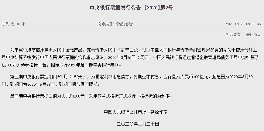 智通财经APP获悉,3月20日,据中国人民央行官网公告,2020年3月26日(周四)中国人民银行将通过香港金融管理局债务工具中央结算系统(CMU)债券投标平台,招标发行2020年第三期中央银行票据。