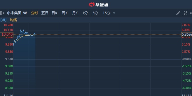 智通财经APP获悉,小米(01810)早盘大幅反弹,收复5日均线,截至10时12分,涨5.35%,报价10.04港元,成交额5.708亿。