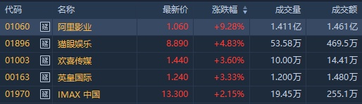 截至发稿,阿里影业(01060)涨9.28%,报1.06港元;猫眼娱乐(01896)涨4.72%,报8.88港元;IMAX中国(01970)涨2.61%,报13.36港元。