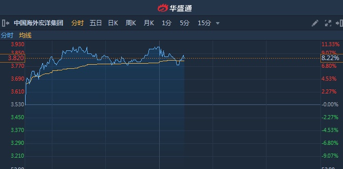 智通财经APP获悉,中国海外宏洋集团(00081)午间发布年度业绩,拥有人应占利润同比增长63%至33.29亿人民币,每股派19.5港仙。截至13时29分,涨8.22%,报价3.82港元,成交额2567万。