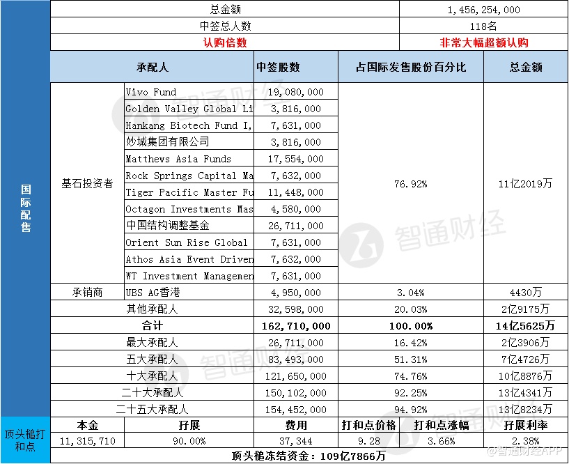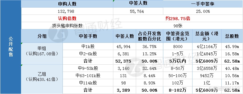 其中,公开配售申购人数132798,一手中签率25%,认购倍数约298.75倍。
