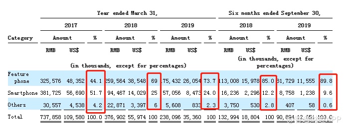 图表显示,近年来联代科技产品逐渐向功能手机侧重,收入占比从2017财年的44.1%飙升至2019财年的73.7%。