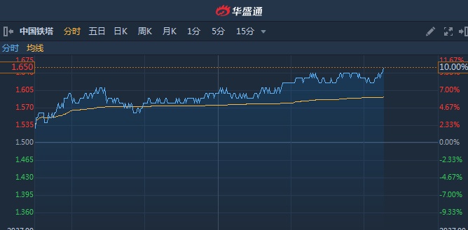 智通财经APP获悉,中国铁塔(00788)获中金重申“跑赢行业”评级,目标价2.50港元。截至15时20分,涨10%,报价1.65港元,成交额12.66亿。