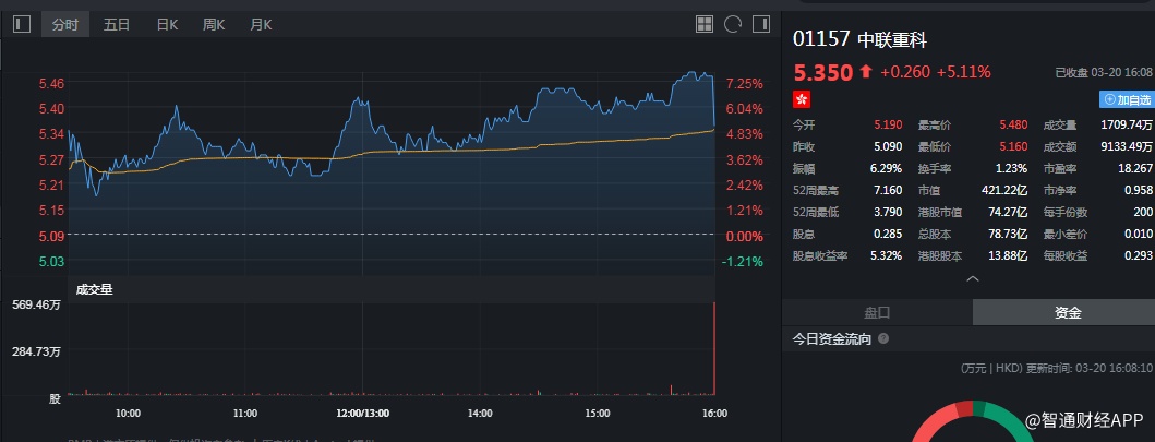 截止今日收盘,中联重科(01157)涨5.11%,报5.35港元。