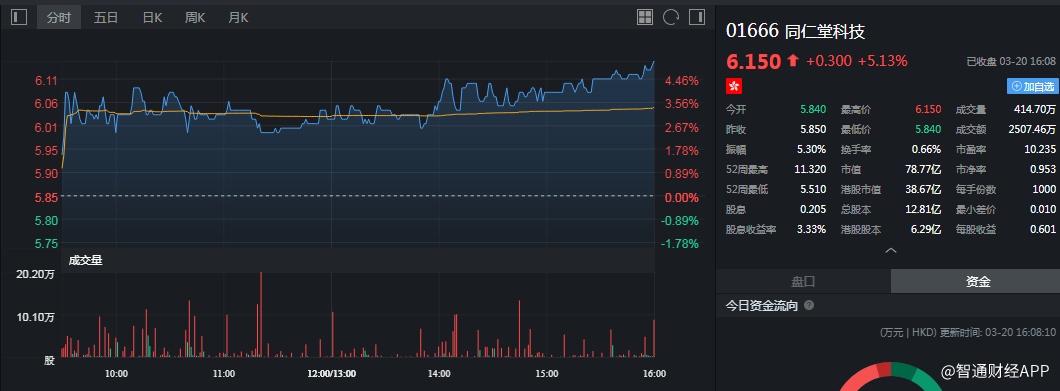 截止今日收盘,同仁堂科技(01666)涨5.13%,报6.15港元。