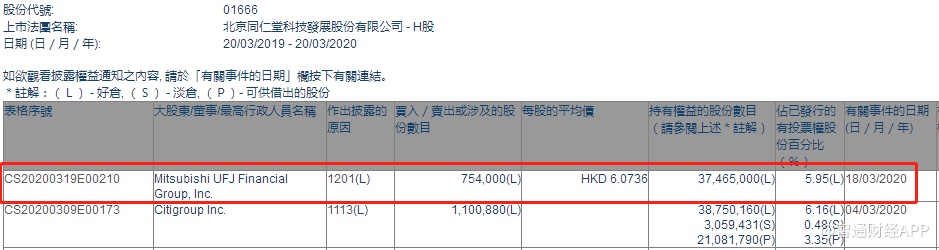 智通财经APP获悉,联交所最新资料显示,3月18日,Mitsubishi UFJ Financial Group减持同仁堂科技(01666)75.4万股,每股作价6.0736港元,总金额约为457.95万港元。智通财经APP获悉,减持后持股数目为3746.5万股,持股比例为5.95%。