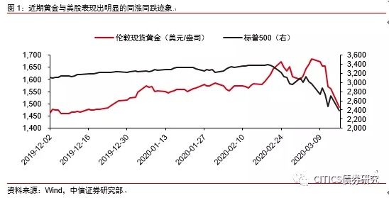 近期黄金与美股表现出明显的同涨同跌迹象。从2019年12月开始的2个半月中,美股和黄金均处于温和上涨阶段,伦敦现货黄金从1477美元/盎司一路上涨至1672美元/盎司,期间标普500也有9%的涨幅。而2020年2月中下旬以来,公共卫生事件在海外的传播抑制了全球金融市场的风险偏好,截至3月18日标普500的累计跌幅已达到29%,然而期间作为避险资产的黄金,也有11%的跌幅。不仅如此,日内行情中黄金与美股的相关性也很强,美股暴跌往往同时对应黄金的大跌。