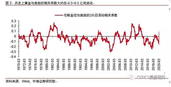 黄金作为避险资产,其与风险资产的相关性本身并不稳定。近期黄金与美股同涨同跌的现象似乎使得贵金属的避险属性有所削弱。我们从历史回顾的角度观察,黄金与美股的相关性本身并不稳定,正相关与负相关的持续时间大约对半。历史上两者的250日滚动相关系数大约在-0.3~0.3之间波动。