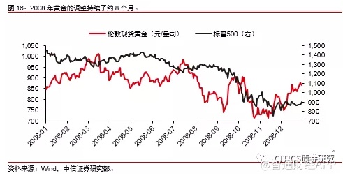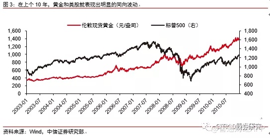 实际上在上个10年,黄金和美股就表现出明显的同向波动。2000年互联网泡沫破灭的调整阶段过后,自2003年开始美股和黄金都进入长达数年的牛市。而在金融危机最剧烈的2008年,黄金在大部分时间也处于熊市,最大跌幅达到10.7%。2009年的复苏阶段过后,黄金和美股重新回到牛市。