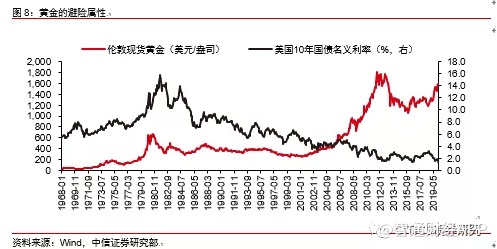1) 黄金与债券价格同步波动的部分,即名义利率,可以称之为避险属性。债券是最常见的避险资产,而名义利率是债券的价格。在通胀预期不变的情况下,实际利率与名义利率同向波动,金价与名义利率反向波动,也就和债券价格同向波动,这就是黄金避险属性的体现。