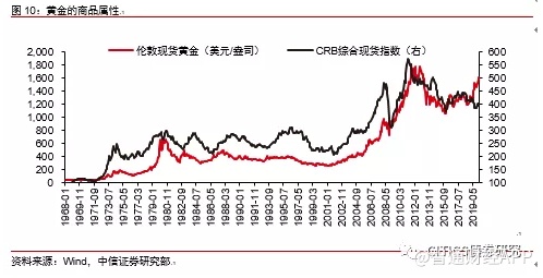 黄金的商品属性并不是指供求对价格影响,而是指大宗商品价格对于作为商品的黄金的锚定作用。虽然我们看到,各类商品根据其产业基本面,价格波动的差异非常之大,但是大宗商品确实存在一个价格中枢,这个中枢即为通货膨胀,各类商品均有跟随这一中枢波动的倾向。一种可能的解释是,各类商品面对相同的宏观经济基本面,由此产生了价格中枢,或者也可以通过货币的价格来进行分析,因为通货膨胀的存在,各类大宗商品有趋同波动的倾向,这两种解释可能指的是同一个意思。