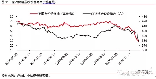 原油暴跌引发商品市场巨震,供给和需求双杀导致通缩预期加剧。近期的原油市场可谓屋漏偏逢连夜雨,COVID-19在全球的蔓延以及隔离措施对工业品需求是一大打压,原油市场在1月底就已逐渐显示这一趋势,3月6日沙特与俄罗斯就减产协议的谈判未能达成一致,沙特阿美意外宣布下调各地原油售价4~8美元/桶,且到4月以后将不再受到减产协议约束,俄罗斯的表态针锋相对,称能够承受原油价格在6~10年内维持在25~30美元/桶的水平。3月17日,布伦特原油已从1月的高点67.7美元/桶降至27.8美元/桶,降幅达到58.9%。