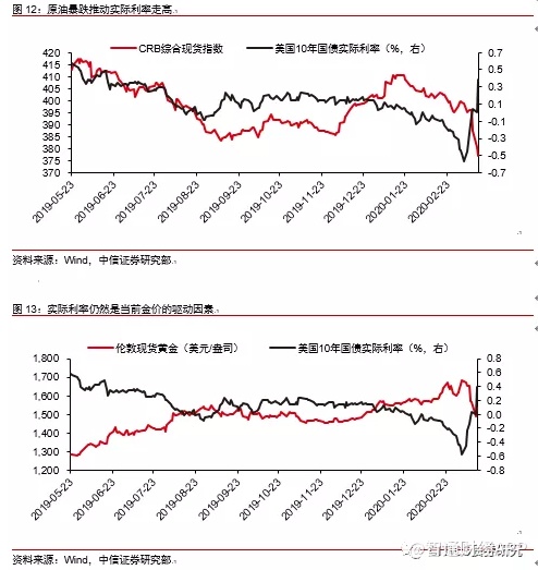 2) 黄金的商品属性是指大宗商品的价格中枢,也即通胀,对黄金价格的影响。债券和黄金同为避险资产,两者差异的关键就在于通胀。高通胀利好黄金,但是利空债券。金融危机期间,大宗商品价格暴跌,通胀预期的跌幅可能超过名义利率的跌幅,此时实际利率不降反升,金价下跌。