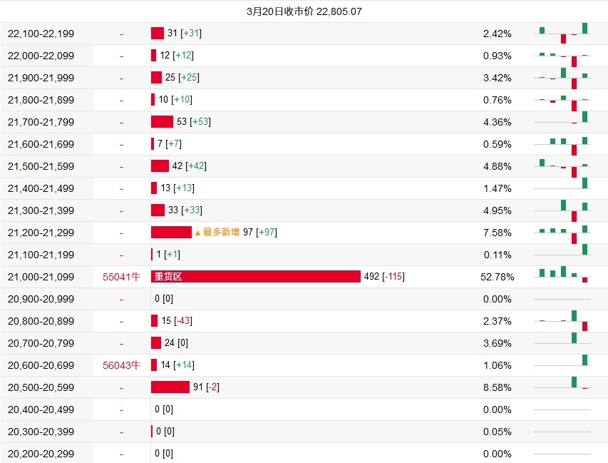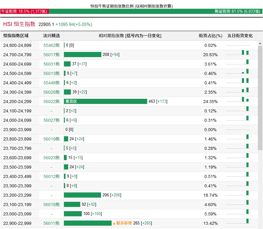 智通财经APP获悉,截至3月20日,恒指最新的牛熊街货比例18:82。法兴恒指牛熊证街货分布图中的数据显示,熊证街货重货区在24200-24299区间,该区间最新熊证数量为463张,较上一交易日增加173张,最多新增在22900-22999区间,该区间最新熊证数量为265张,较上一交易日增加265张。牛证街货重货区在21000-21099区间,该区间最新牛证数量为492张,较上一交易日减少115张,最多新增在21200-21299区间,该区间最新熊证数量为97张,较上一交易日增加97张。
