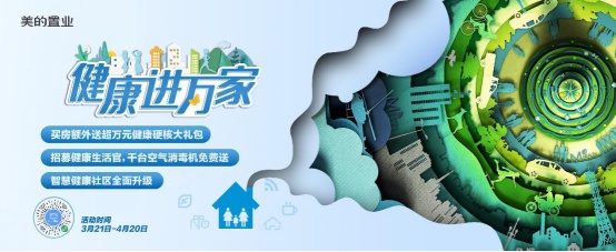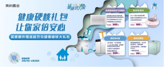 3月21-4月20日,凡购房美的置业各地楼盘房产的客户,可额外获赠超万元的健康硬核大礼包,内含美的置业联合研发的医用级智能空气消毒机,及美的净水器、除螨仪、纯蒸箱,覆盖了家庭空气消毒、水净化、生活起居健康、饮食健康等。