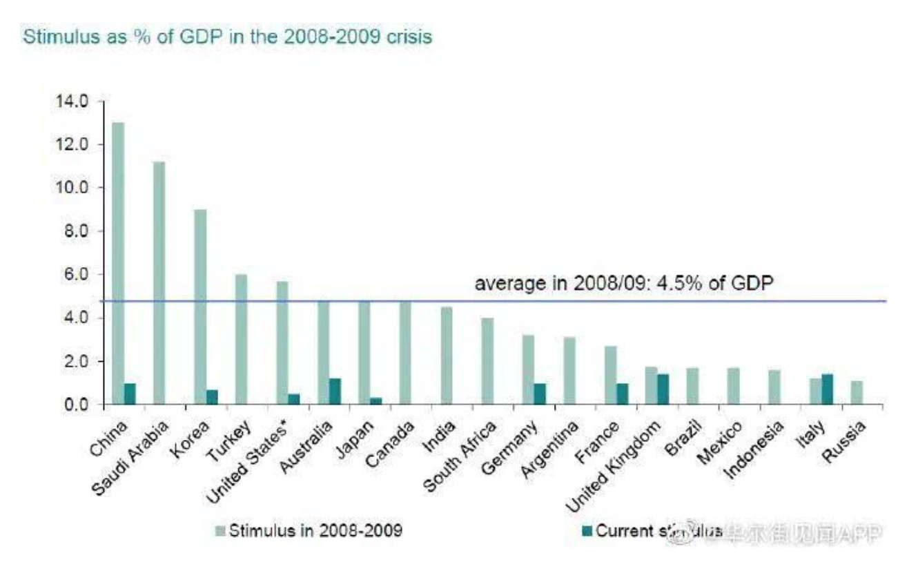 遥想2008年金融危机的时候,全球推出的刺激措施在GDP中的占比平均只有4.5%!