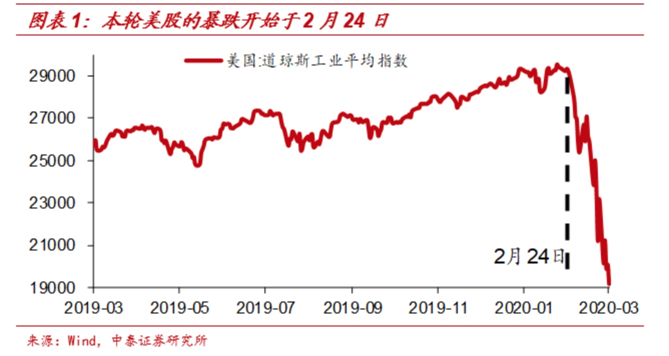 回溯近期的走势,美股的暴跌开始于2月24日。在此之前的几个交易日,美股虽然也有下跌,但每天的波动幅度都在1%以内。而2月24日当天,美国道琼斯指数大跌1000点以上,跌幅达到了3.6%,之后就开始直线往下掉。