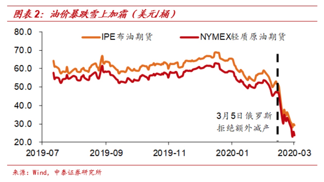 原油额外减产协议失败,导致油价暴跌,对风险资产相当于“雪上加霜”。公共卫生事件冲击全球经济,原油价格本身就有调整压力,但每天的跌幅也大都不超过4%。而3月5日,俄罗斯拒绝了OPEC额外减产的提议,导致3月6日当天原油价格暴跌了9%以上。当周末沙特突然宣布将大幅提高原油产量,导致国际油价进一步暴跌27%。