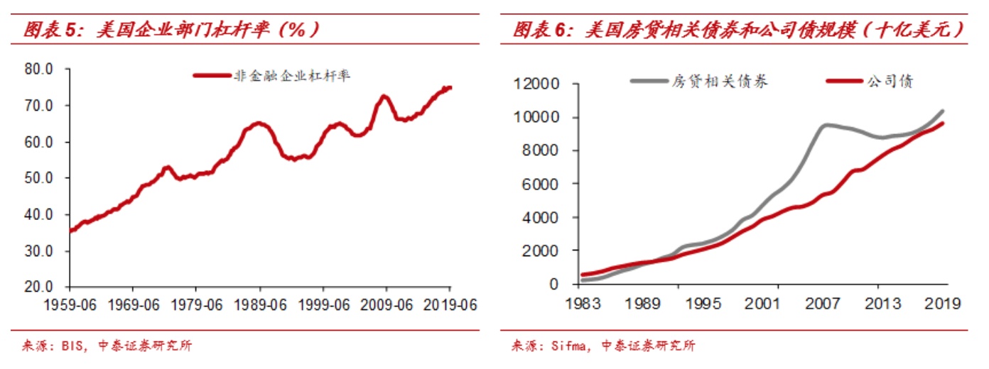 从债券发行的情况也可以看出这一点,在2008年的时候,美国公司债规模只有5.5万亿美元,只有当时居民房贷相关债券规模的6成左右,但截至2019年底,美国公司债规模已经达到了9.6万亿美元,是居民房贷相关债券规模的9成以上。这也说明08年以后,企业部门加杠杆的速度要远远快于居民部门。