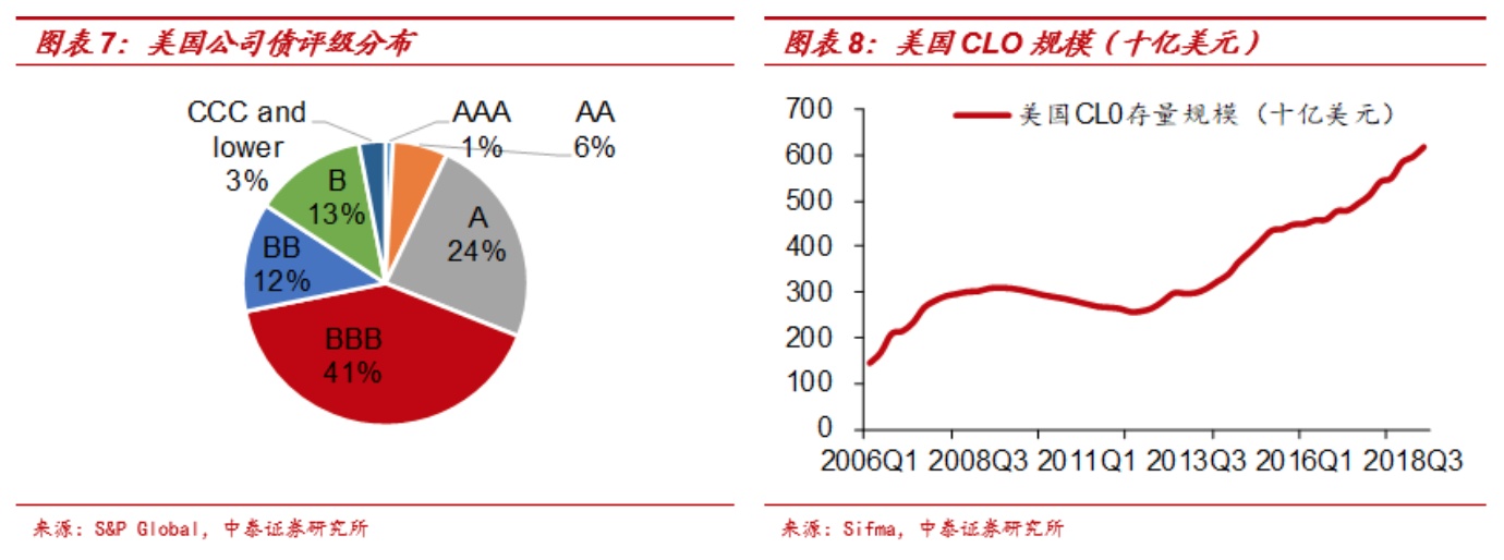 此外,杠杆贷款也是美国低评级企业融资的重要债务工具,08年以来美国杠杆贷款规模快速扩张,已经翻倍到了1.4万亿美元的规模。而基于杠杆贷款设计的结构化高收益产品CLO的规模,在2018年底就已经翻倍到了6000亿美元以上。CLO和引起次贷危机的CMO是类似的,区别在于,CLO的底层资产是低评级企业的贷款,而CMO的底层资产是居民房贷。