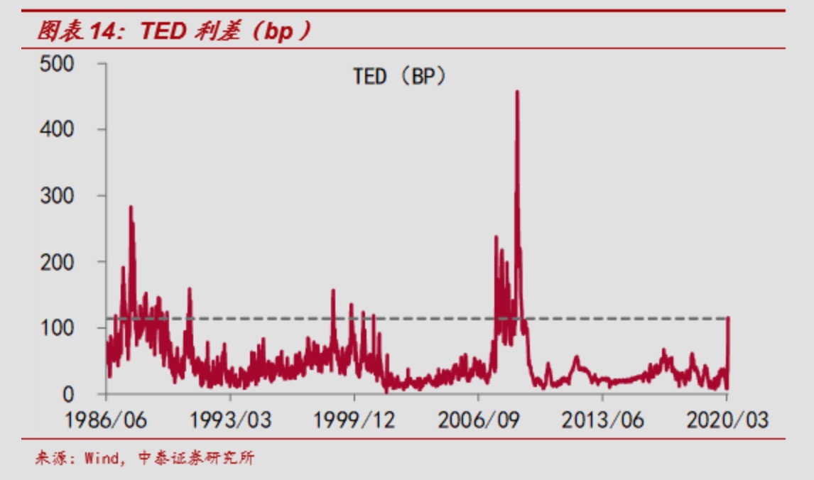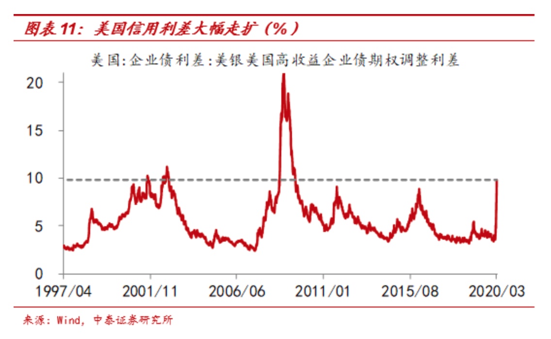 3、短期重点并不是信用,而是流动性。短期来看,美国股市的大跌很大程度上是泡沫从“追涨”的模式转向了“杀跌”,资金踩踏离场。而美国债市的问题,更多在于恐慌带来的流动性问题,重点还不在信用。流动性风险也同样波及了避险资产,甚至出现了“美元荒”。
