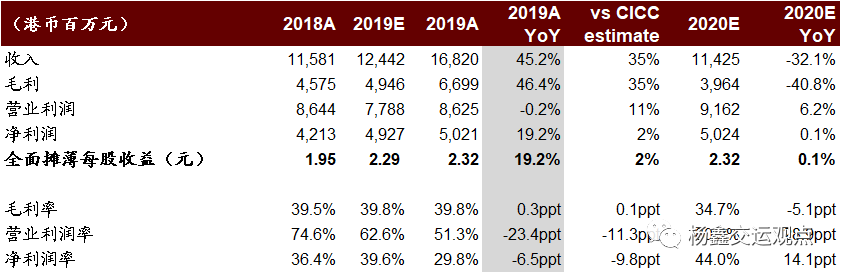 公司公布全年业绩:收入同比增长45%至168亿港币;EBIT同比增长1%至99亿港币,净利润同比增长19%增至50亿港币。公司拟派发期末股息0.53港币和特别股息0.64港币,总派息率50%,对应2019年股息收益率8.7%。业绩与分红均符合我们预期。