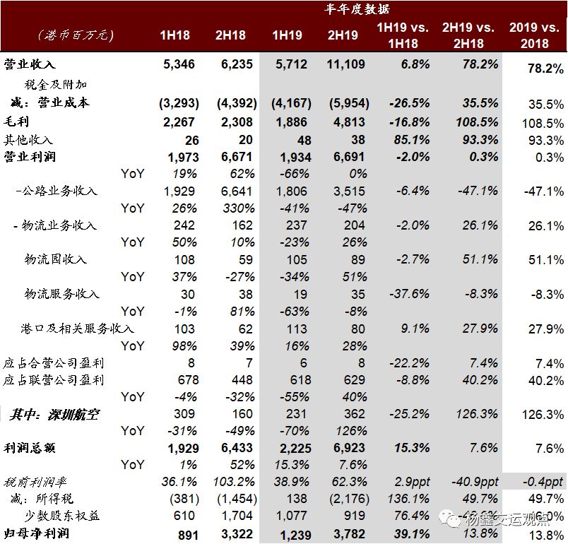 核心业务分部业绩:1)收费公路收入同比下滑6%至71亿港元,分部利润同比下滑3%至13亿港元,下滑主要因为2018年底四条高速被政府收回不再贡献收益,扣除该部分影响后全年通行费收入同比增长5%;2)物流收入同比增长182%至78亿港元,分部利润同比增长453%至16亿港元,高增速主要由梅林关房产项目开发收益13亿港币带来,物流业务盈利内生增长5%。3)参股的深圳航空投资收益增长26%至6亿港元,主要受益于客运量增长、航油成本减少与汇兑损失减少。非核心收益同比下滑16%至21亿港币(2019年前海土地确认补偿收益18亿港币+西坝码头资产处置收益3亿港币,vs2018年公路回购收益26亿港元)。
