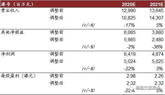 考虑卫生事件影响,下调2020年净利润22%至50.24亿港币(+0%YoY),上调2021年净利润3%至50.25亿港币(+0%YoY)。当前股价对应2020/2021年5.8倍/5.8倍市盈率与8.7%/8.7%分红收益率。高分红收益在当前大幅波动市场中吸引力强,重申跑赢行业评级,但因市场风险偏好下降,我们下调目标价11%至19.43港元,对应2020年8.4倍市盈率和6%分红收益率,较当前有45%上行空间。
