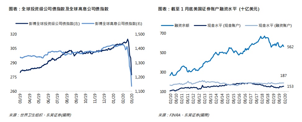 公共卫生事件引发信贷危机恐慌。欧美的病例于 3 月急升,欧洲多个采取非常严厉措施控制公共卫生事件,包括强制商店关门、以罚款禁止国民外出等,严重打击经济活动,将导致短期内出现经济衰退。部分企业经营出现困难,缺乏收入及现金流;加上油价下跌将令一些债台高筑的石油企业出现债务违约,企业债券缺乏承接而价格大跌,市场流动性枯竭,令人担心会出现信贷危机。另一方面,过去多年欧美因低息助长投资者采用高杠杆,包括大量低波幅策略基金,风险均衡策略、目标波动策略的基金规模估计达 1.5 万亿美元。市场急跌导致严重亏损,加上基金赎回迫使他们去杠杆,加速市场下跌。环球央行已迅速减息,但被视为无助解决当前危机,市场急促下滑,进一步加深市场恐慌,导致恶性循环。